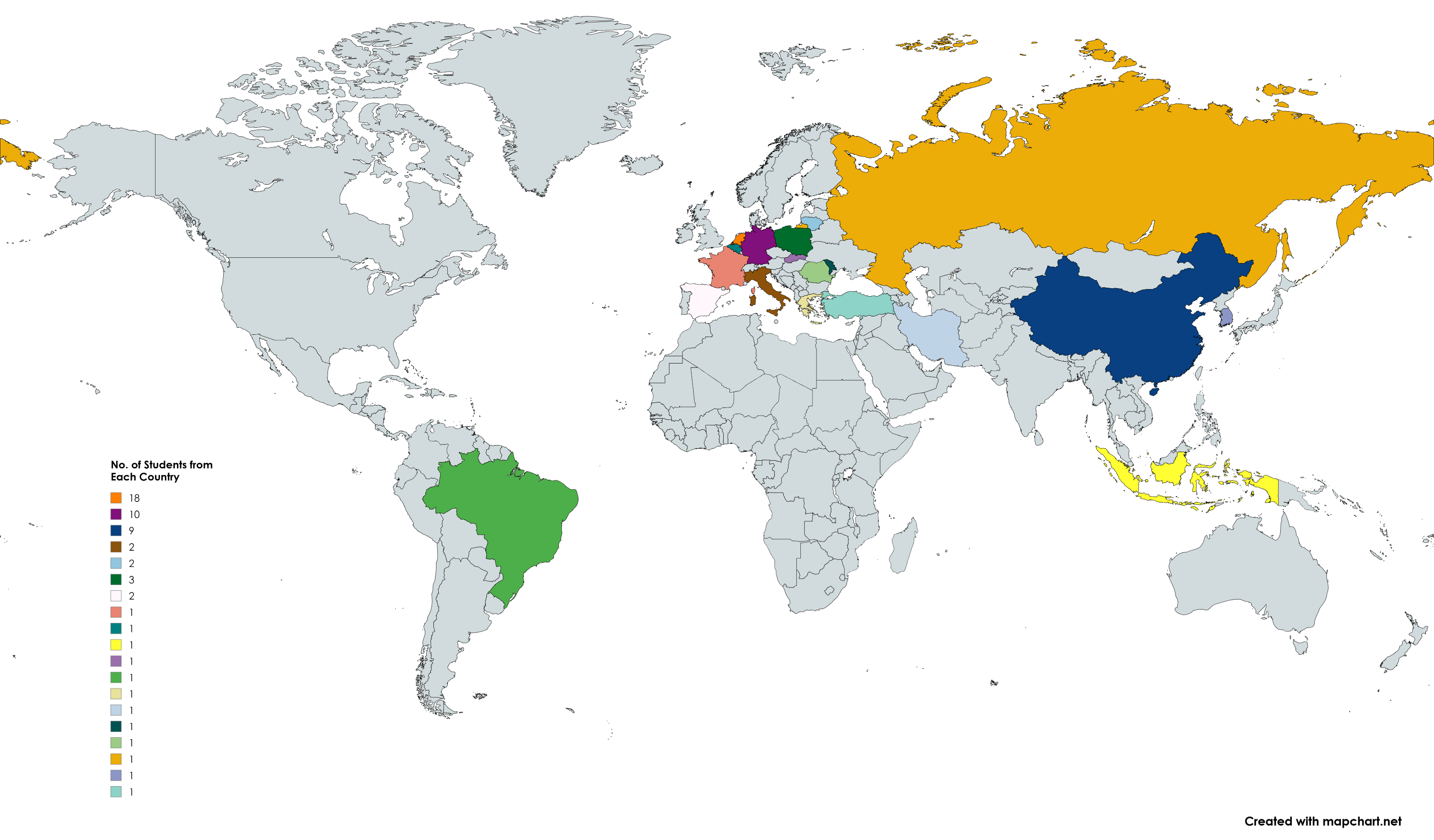 Studying at TI is an international experience. In your class you will meet students from all continents. The map below indicates the places of origin of TI’s Research Master students over the years 2021-2023. The key on the left indicates the number of students from each country during this period of time.